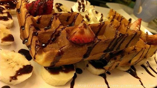 香蕉包圍著兩大塊三角鬆餅,在淋上甜甜的巧克力醬