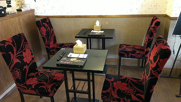 椅子以黑底紅色紋路為主,有著常見日式搭配色彩的風格